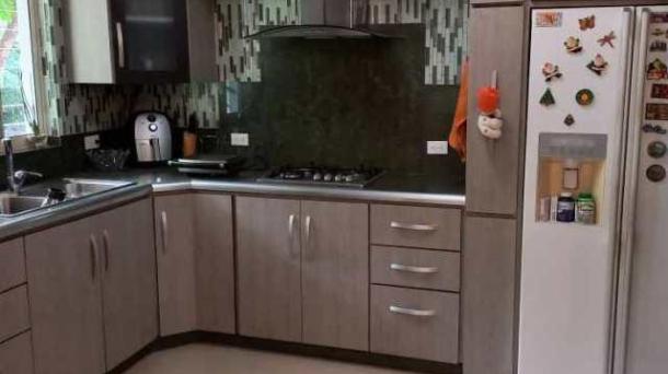 Hermosa cocina empotrada con campana y fachada de azulejo...